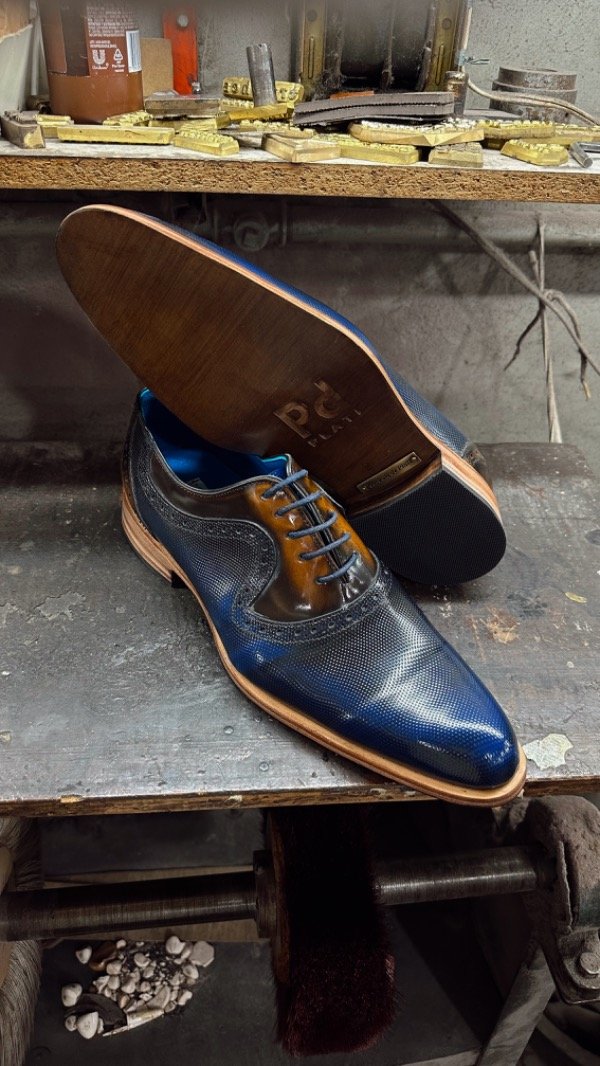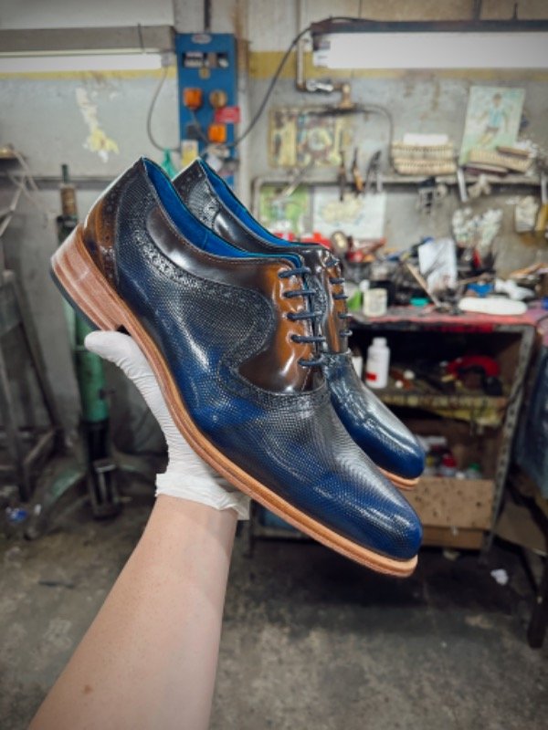 Exterior en cuero vacuno trama picado fino azul claroscuro combinado con color suela claroscuro